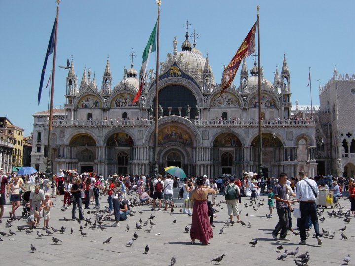 Piazza San Marco - Pyhän Markuksen tori. Tuomiokirkon edessä noin miljoona pulua ja jokunen turisti. VENETSIA