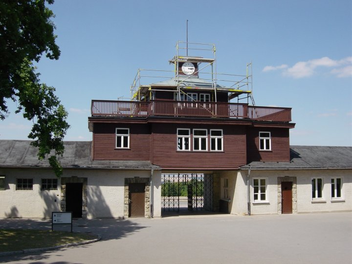 Buchenwaldin keskitysleiri. Pääportin kello on pysäytetty aikaan 15.15. Amerikkalaiset sotilaat saapuivat vapauttamaan leiriä huhtikuun 11. vuonna 1945 kello 15.15. BUCHENWALD