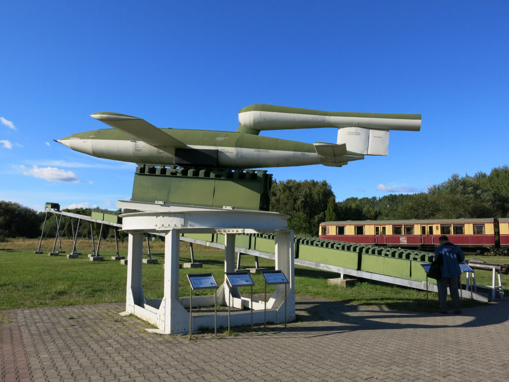 V2-ohjusta edeltänyt äärimmäisen epätarkka V1-ohjus ja laukaisukisko.