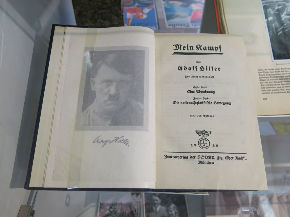 Adolf Hitlerin Mein Kampf, nimikirjoituksella, linnan museossa. Kirja oli 1930-luvun Saksassa raamatun ohella myydyin kirja. Vihkipareille se jaettiinkin raamatun ohella ilmaiseksi. WEWELSBURG, SAKSA