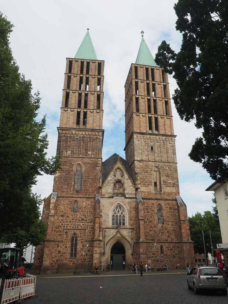 Martinskirche. Lokakuun 1943 pommituksissa sortuneet kirkontornit korvattiin, selvästi nähtävissä olevilla, uusilla ja erilaisilla 1950-luvulla. Kassel, SAKSA