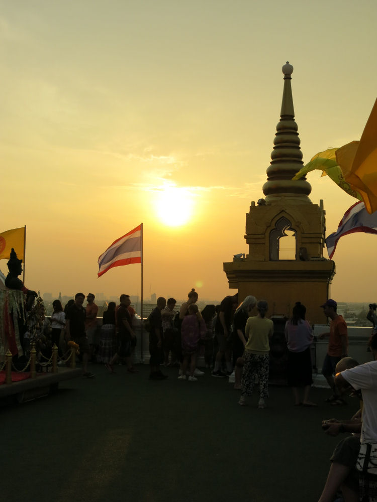 Wat Saketin temppelin kattoterassille kerääntyi suuri määrä ihmisiä seuraamaan auringonlaskua.