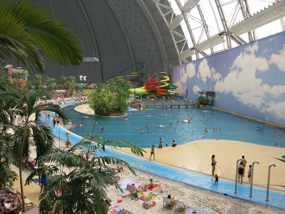 Tropical Islands. Yli 100 metriä korkeaan, 360 metriä pitkään ja 220 metriä leveään halliin mahtuu hiekkarannat, laguunit ja sademetsät. KRAUSNICK
