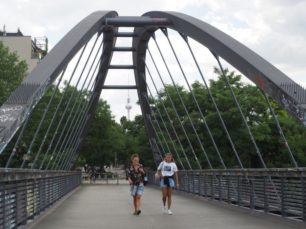 Schwedter Steg. Parisataametrinen kevyen liikenteen silta ylittää kiskot ja muun alapuolen hässäkän. PRENZLAUER BERG