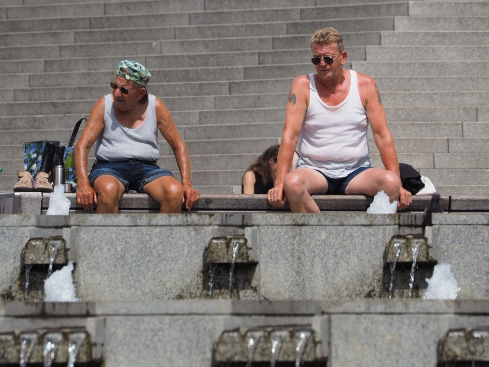 Ukot vilvoittelee jalkojaan suihkulähteessä.