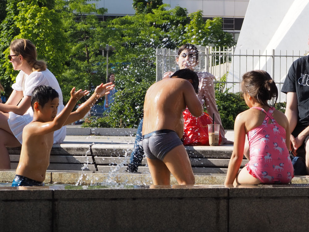 Wasserkaskaden. Lapset eivät tyytyneet pelkkään jalkojen huljutteluun, vaan painoivat suihkulähteeseen uimaan. MITTE