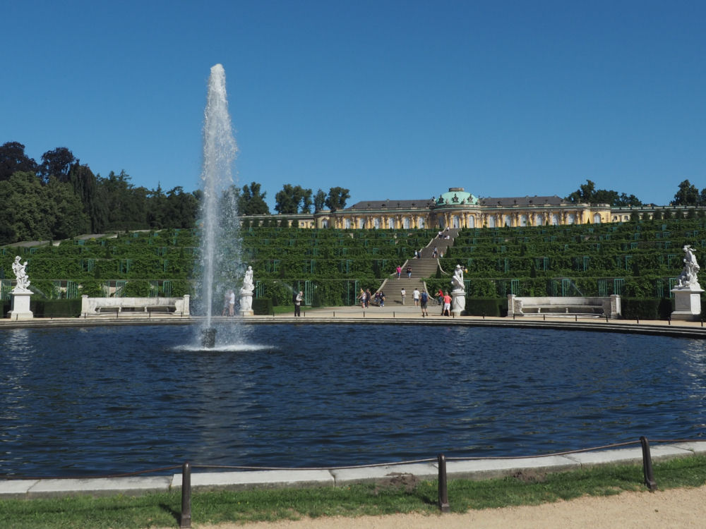 Sanssoucin puisto. Preussin kuninkaan Fredrik Suuren rakennuttama (ja osin suunnittelema) valtava puisto. Suihkulähteen takana Sanssoucin linna. POTSDAM