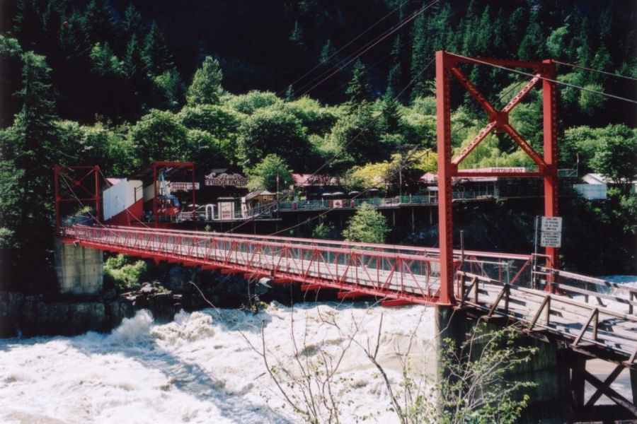 Kallioiden puristuksessa Fraserjoki muuttuu kuohuavaksi koskeksi.