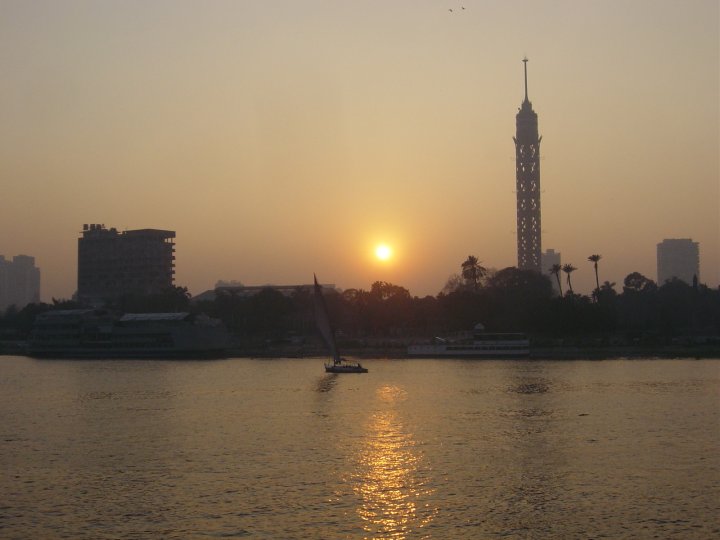 Auringonlasku Niilillä. 187 metrinen Cairo Tower hallitsee jokinäkymää.