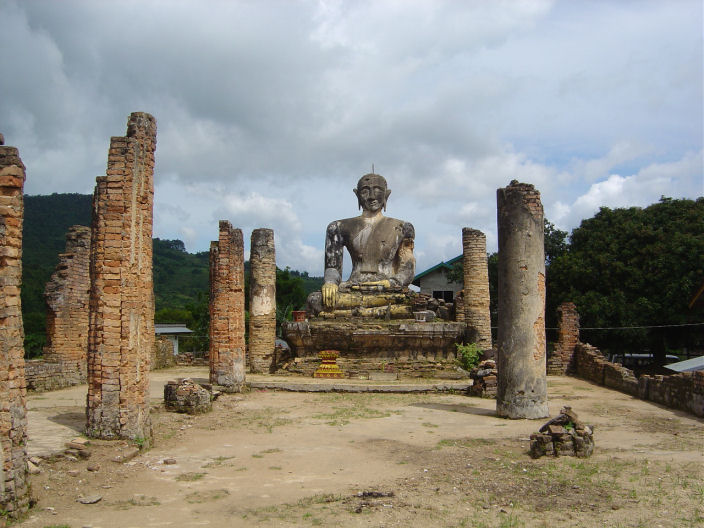 Xieng Khouangin vanha kaupunki. Tässä oli aikoinaan hieno Wat Pia Watin temppeli 1500-luvulta. Vietnamin sodan pommituksissa temppeli kuitenkin tuhoutui. Buddhaakin on tarvinut ohimoon ampua. Ei mitään tapoja. XIENG KHOUANG, LAOS