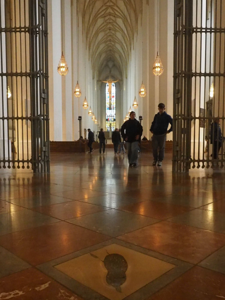 Frauenkirche. "Paholaisen jalanjälki" kirkon eteisessä. Näyttäis kyllä mun mielestäni koon 44 kengältä.
