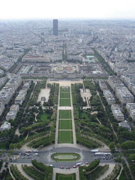 Champ de Mars-puisto. Kauempana yli 200 metrinen Montparnasse tornitalo.