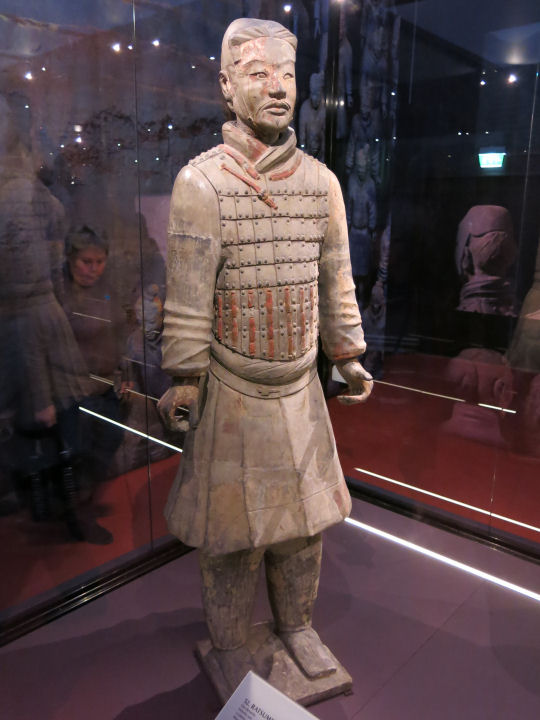Terrakotta-armeijan ratsumies. Alun perin hahmoilla oli oikeat pronssiaseet, mutta suurin osa niistä ryöstettiin keisarin kuolemaa seuranneen sekasorron aikana. Vapriikki. TAMPERE 2013