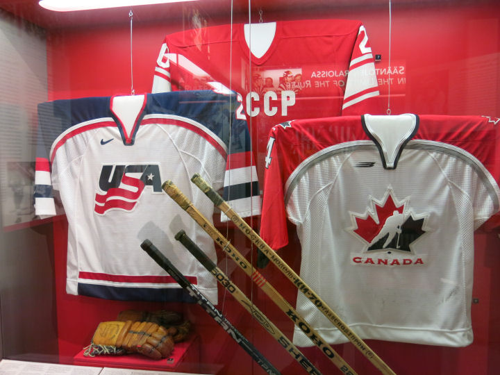 Brian Leetchin maajoukkuepaita Salt Lake Cityn olympiakisoista 2002, Vladislav Tretjakin maajoukkuepaita Kanada Cupista 1981,