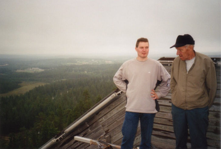 Taivalvaaran hyppyrimäen päällä papan kanssa. Tavattiinpa mäen juurella myös ensimmäinen suomalainen suurmäen maailmanmestari Tapio Räisänen. Pappa sitä jututti. Tuntui olevan edelleen innokas mäkimies! TAIVALKOSKI 2001