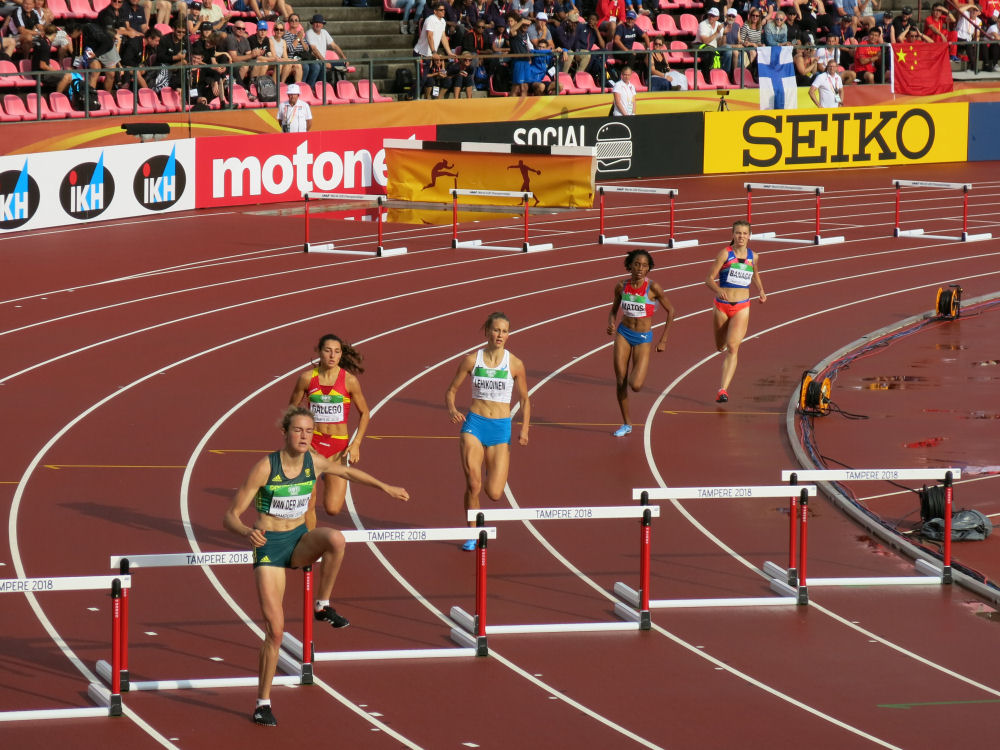 Yleisurheilun alle 20-vuotiaiden maailmanmestaruuskilpailut. Naisten 400 metrin aitojen semifinaali. Suomen Viivi Lehikoinen keskellä. TAMPERE 2018
