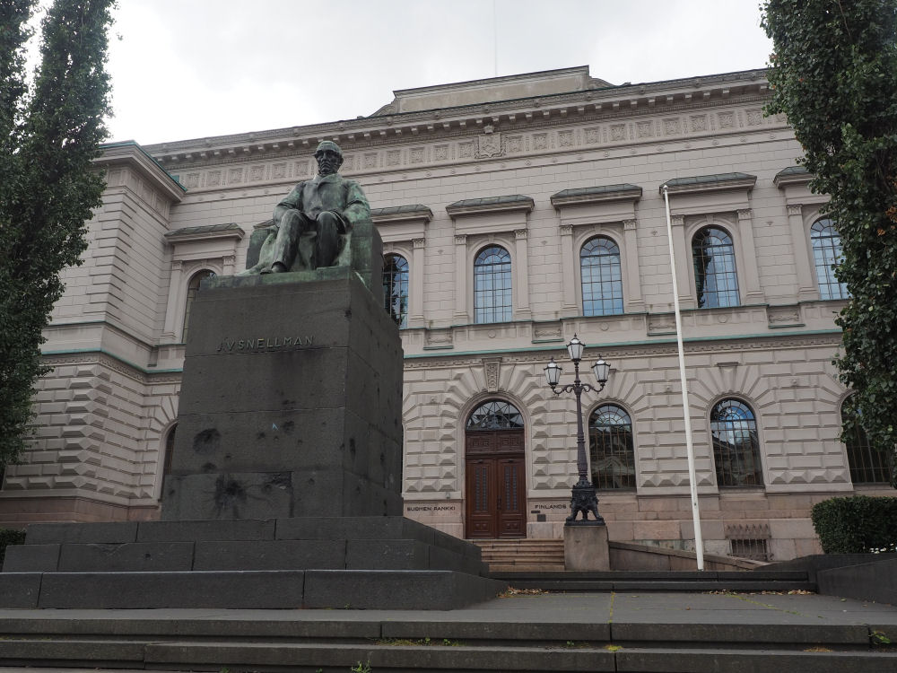 Suomen pankin pääkonttori. J.V. Snellmanin patsaassa on edelleen nähtävissä jatkosodan suurpommitusten jäljet. HELSINKI 2022