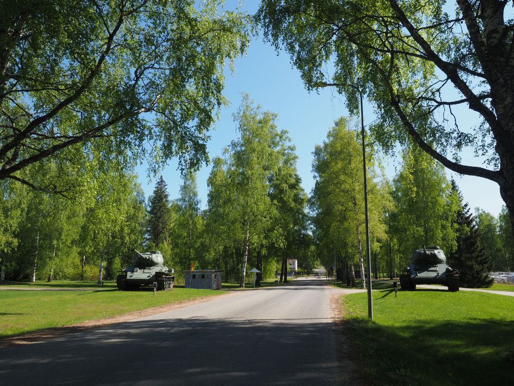 Parolannummen panssariprikaati. Varuskunnan sisäänmenotien kummallekin puolelle on laitettu vanhat neuvostoliittolaiset "Sotkat", T-34 -panssarivaunut. HATTULA 2023