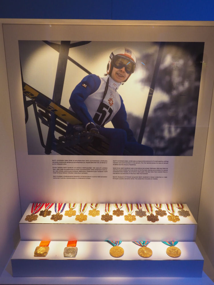 Museo Tahto - Suomen Urheilumuseo. Maailman parhaan mäkihyppääjän Matti Nykäsen olympia- (5 kpl) ja MM-mitalit (14 kpl). HELSINKI 2023