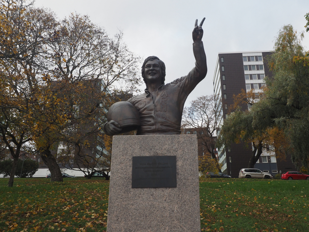 Ainoan suomalaisen ratamoottoripyöräilyn maailmanmestarin, Jarno Saarisen, patsas Aurajoen rannalla. TURKU 2024