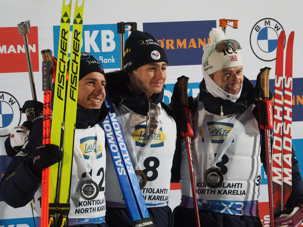 Ampumahiihdon maailmancup 2024-2025. Miesten yhteislähdön kärkikolmikko: Éric Perrot (FRA) (kesk.), Quentin Fillon Maillet (FRA) (vas.) ja Sturla Holm Lægreid (NOR) (oik.). KONTIOLAHTI 2024