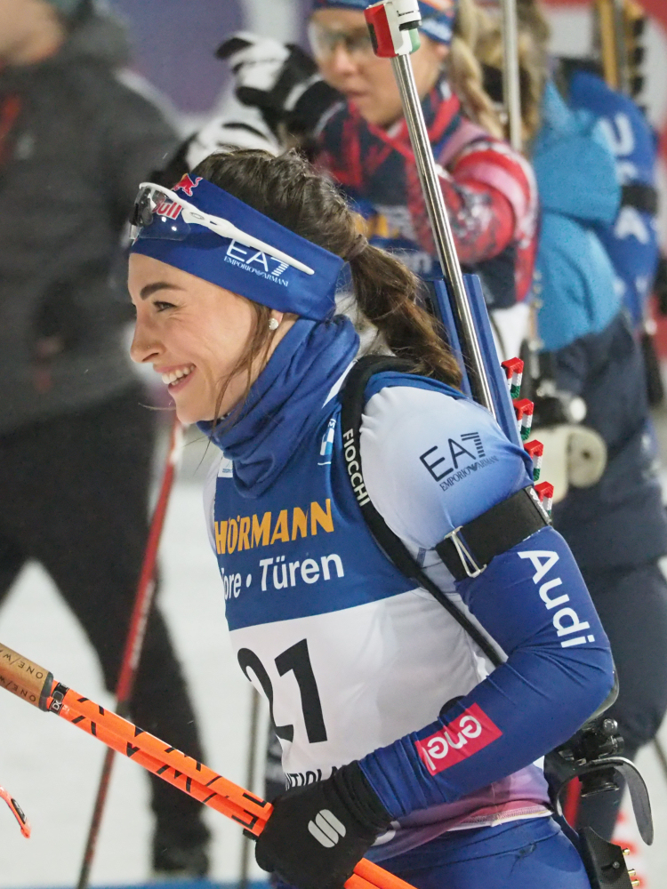 Ampumahiihdon maailmancup 2024-2025. Dorothea Wierer (ITA) huuteli hymy huulilla vitsejä muille vielä ennen kilpailun alkua. KONTIOLAHTI 2024