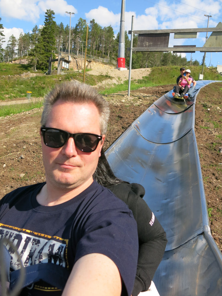 Ja kelkalla alas. Juha ja Ya-hui peesaavat.
