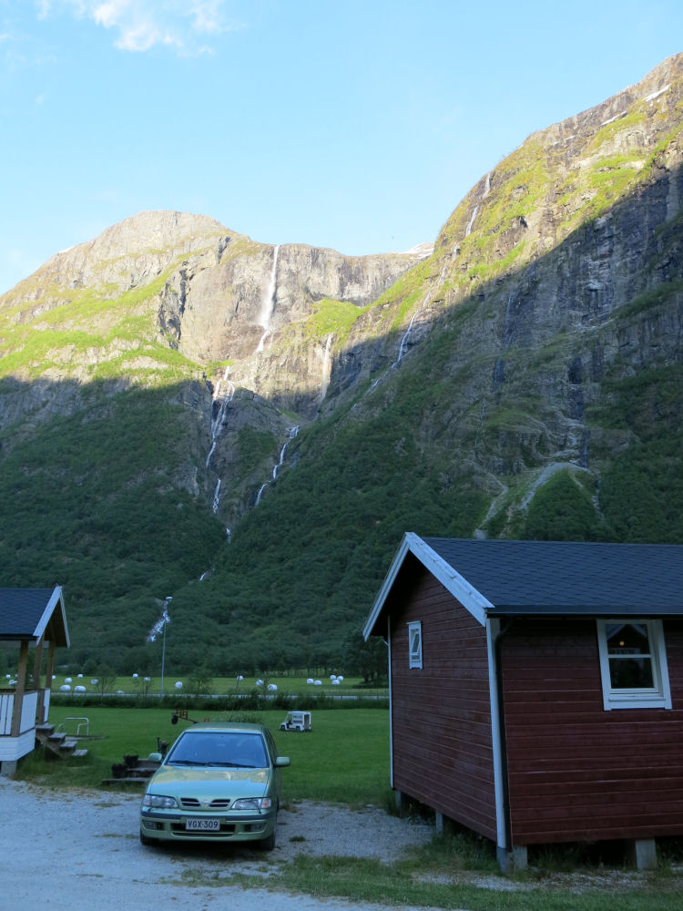 Mökki hienolla paikalla kahden pystysuoran vuoren välissä.