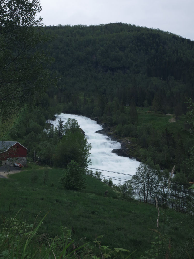 Vallestadfossen. Yksi liki kolmestakymmenestä putouksesta Riksvei 13:n varrella.