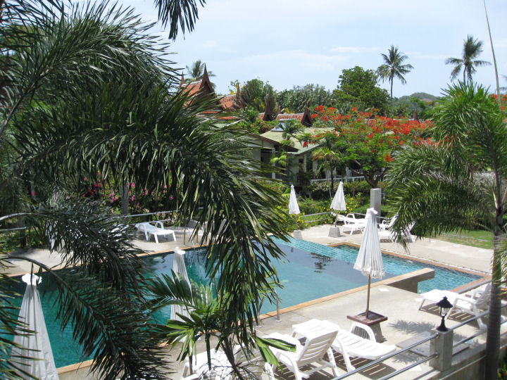 Parvekkeen alla uima-allas.