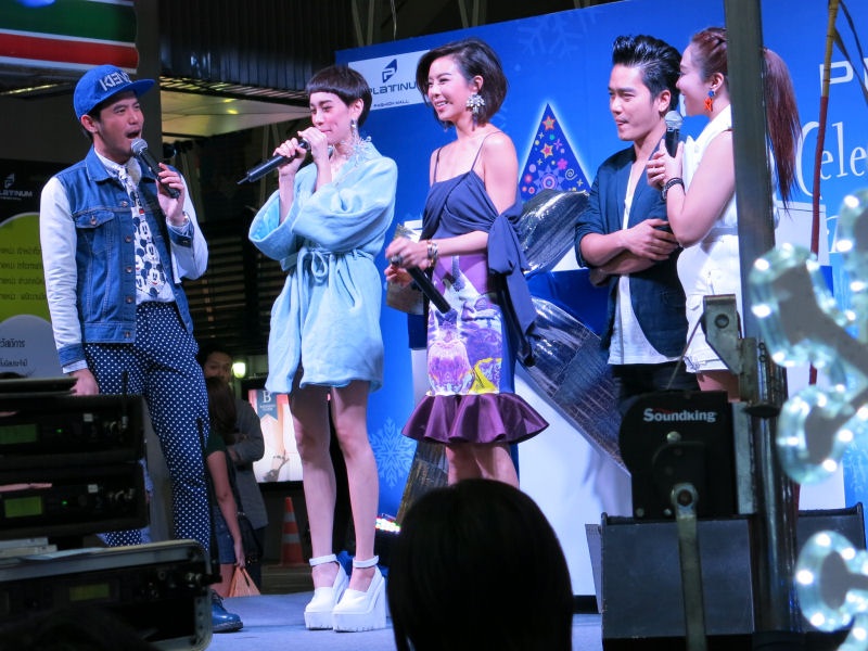 Aida (toinen vasemmalta) ja Chris (keskellä), thaimaalaiset näyttelijät haastattelussa Platinumin edustalla. BANGKOK