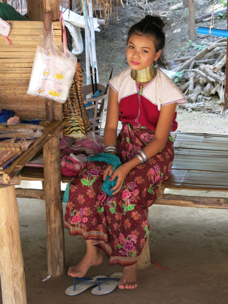 Pitkäkaulainen Karen-heimon tyttö. Thaimaan hallitus ei suostu antamaan pakolaisina Burmasta tulleille Kareneille kansalaisuutta, vaan pakkoasuttaa nämä hökkelikyliin turistien nähtäväksi