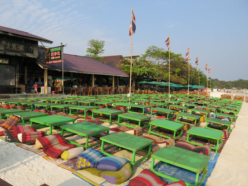 Vanha kunnon Ploy Thalay on kasvanut jo liian isoksi. Yli 100 ruokapöytää kannetaan joka ilta rannalle. KO SAMET
