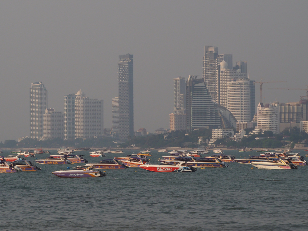 Mahdoton määrä veneitä likaisella Pattayanlahdella.