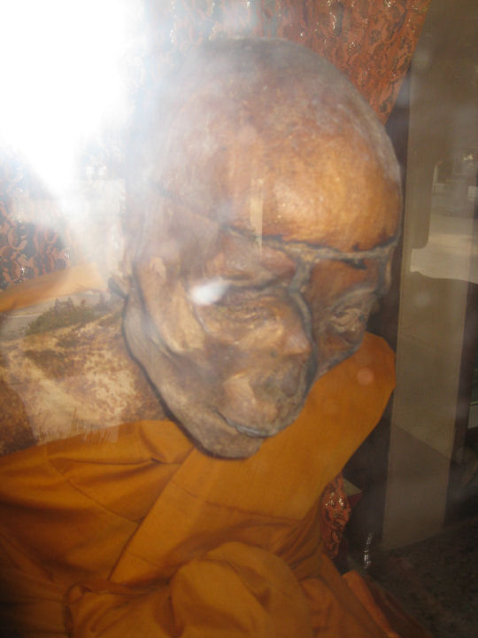 Muumioitunut munkin ruumis esillä lasivitriinissä.