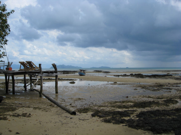 Ranta on aamun laskuveden aikaan vetäytynyt kauas laiturista.
