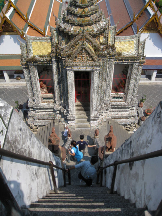 Wat Arunin jyrkät portaat, joita pidettiin turisteille niin vaarallisina, että temppelin ylätasanteisiin ei ollut pääsyä vuosikausiin. BANGKOK