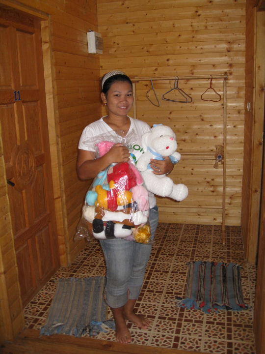 Pussillinen tikanheitolla voitettuja pehmoleluja.