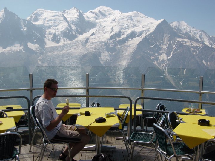 Breventin näköalapaikka 2525 metrissä. Jäätelökään ei sulanut. Taustalla vielä korkeammalle kohoaa Mont Blanc. CHAMONIX