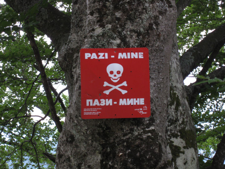 Maastossa on sisällissodan jäljiltä suuri määrä räjähtämättömiä miinoja ja pommeja. Kyltit varoittavat vaarasta kaikkialla keskustan ulkopuolella. SARAJEVO, BOSNIA JA HERTSEGOVINA