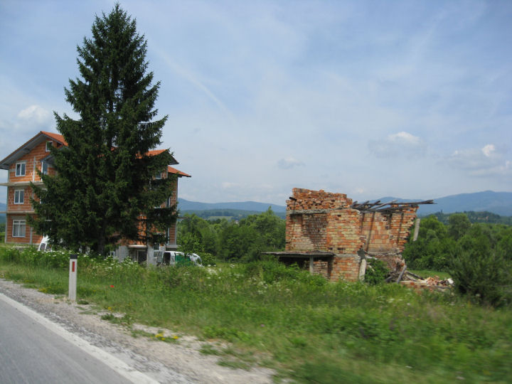 Maaseudulla lähes jokainen talo on rakennettu uudelleen sodan jälkeen. Vanhat jämät on poikkeuksetta jätetty uuden talon viereen. Ehkä muistuttamaan tapahtuneesta. SARAJEVO, BOSNIA JA HERTSEGOVINA