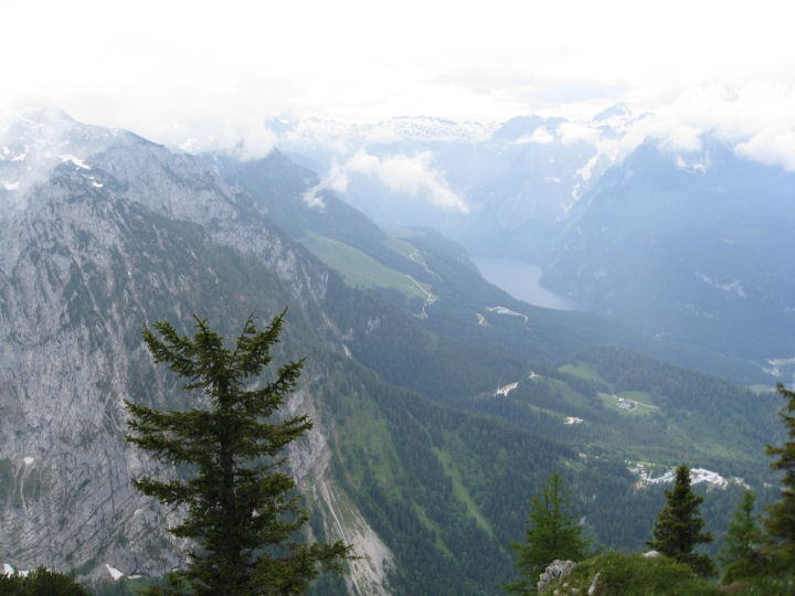 Näkymät Kotkanpesältä alas laaksoon ja Königsseelle ovat selkeällä säällä hienot. BERCHTESGADEN, SAKSA