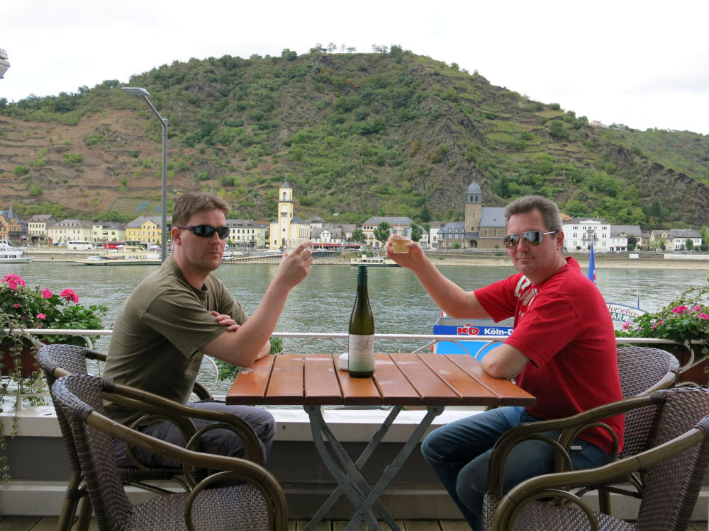 Rheinhotelin parvekkeella, taustan rinteiltä poimituista rypäleistä valmistettua Rieslingiä nauttimassa. Hah! SANKT GOAR, SAKSA
