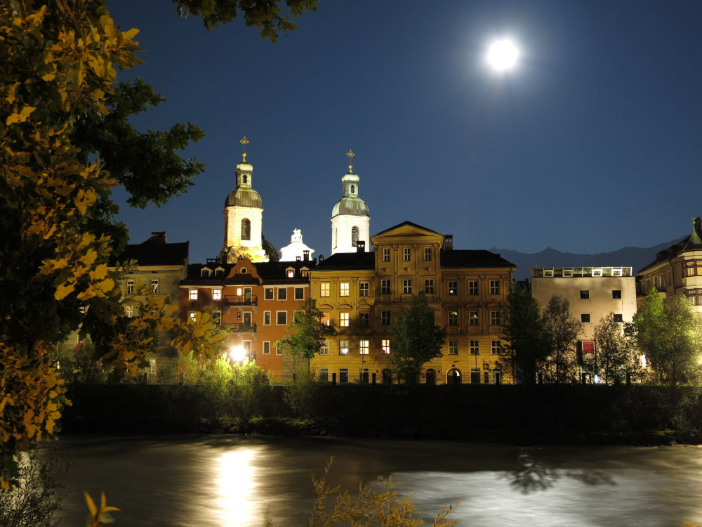 Kaupungin halkova Tonavan sivujoki Inn, taustalla St. Jakobin tuomiokirkko.