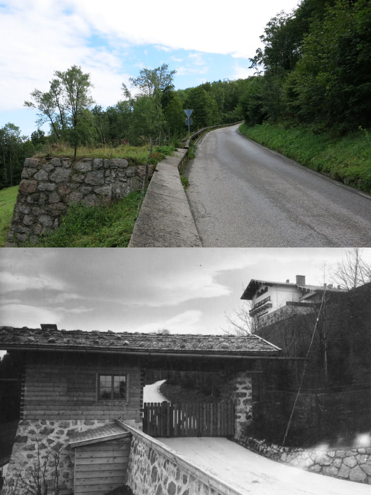 Ennen ja jälkeen: Adolf Hitlerin asunnolle johtavan tien varrella oli ennen vartiomiehen koppi. Hitlerin asunto 'Berghof' näkyy vanhan kuvan oikeassa yläkulmassa. BERCHTESGADEN, SAKSA
