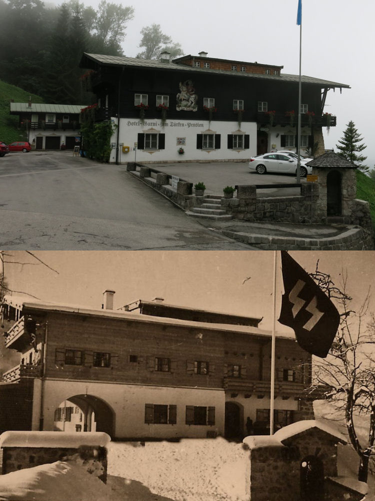 Hotelli Zum Türken. Ennen ja jälkeen: SS-lippu on tangossa vaihtunut ja vartiomiestä ei enää tarvita. BERCHTESGADEN, SAKSA