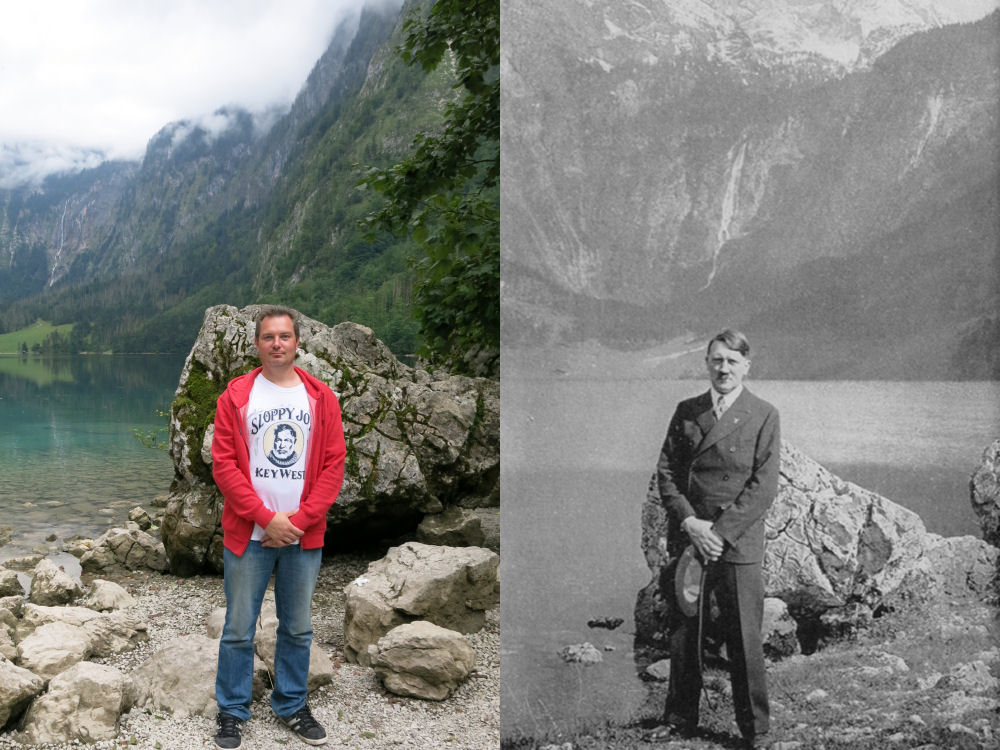 Obersee. Ennen ja jälkeen: Adolf Hitler tuli useasti kesäisin Königsseen ja Oberseen maisemiin. Oberseen rannalla on Führerin suosikkikivi, jonka luona hän monesti kuvautti itsensä. BERCHTESGADEN, SAKSA