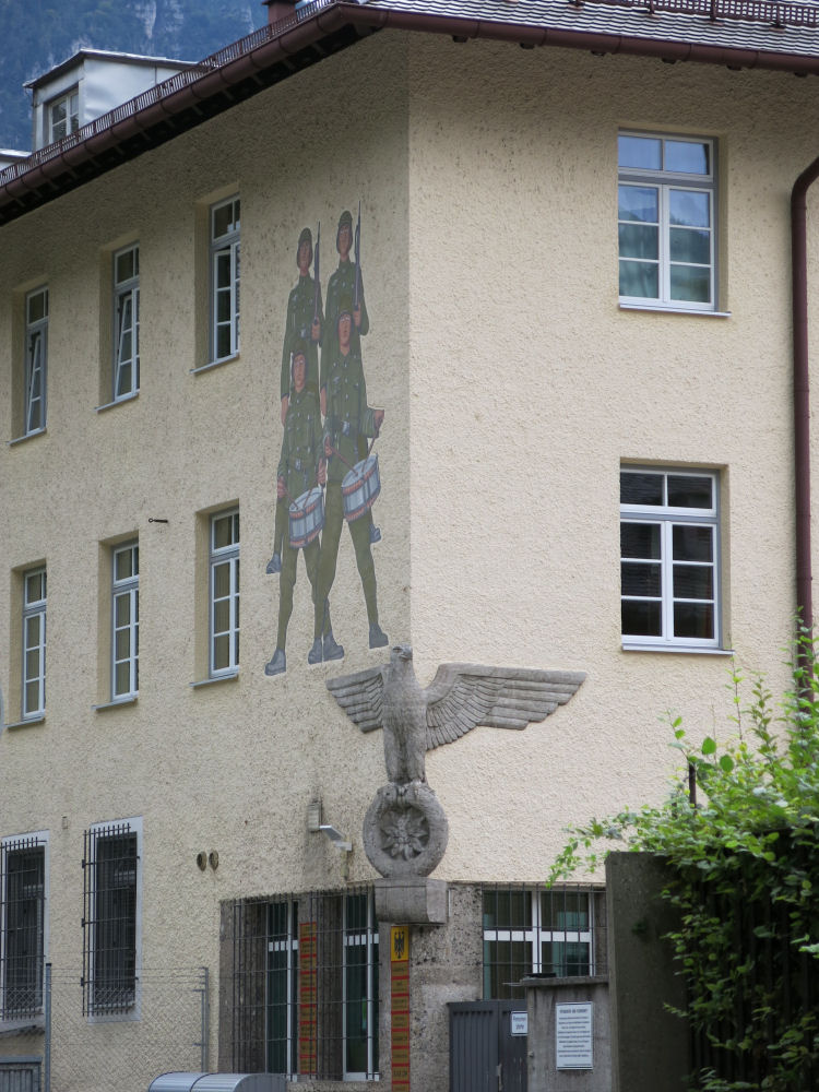 Bad Reichenhall. Tykistökasarmin Natsikotkan hakaristi on korvattu edelweissilla (alppitähti). BERCHTESGADEN, SAKSA