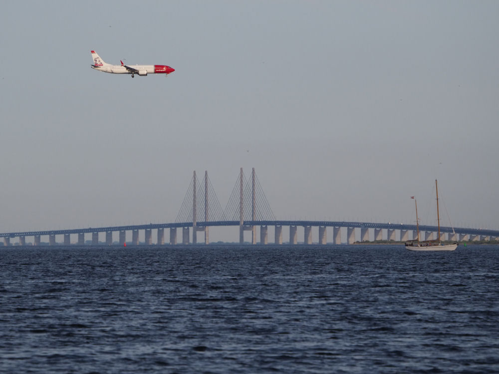 Maalla, merellä ja ilmassa. Norwegianin lentokone laskeutumassa, ketsi ankkurissa ja taustalla Juutinrauman silta. Kööpenhamina, TANSKA