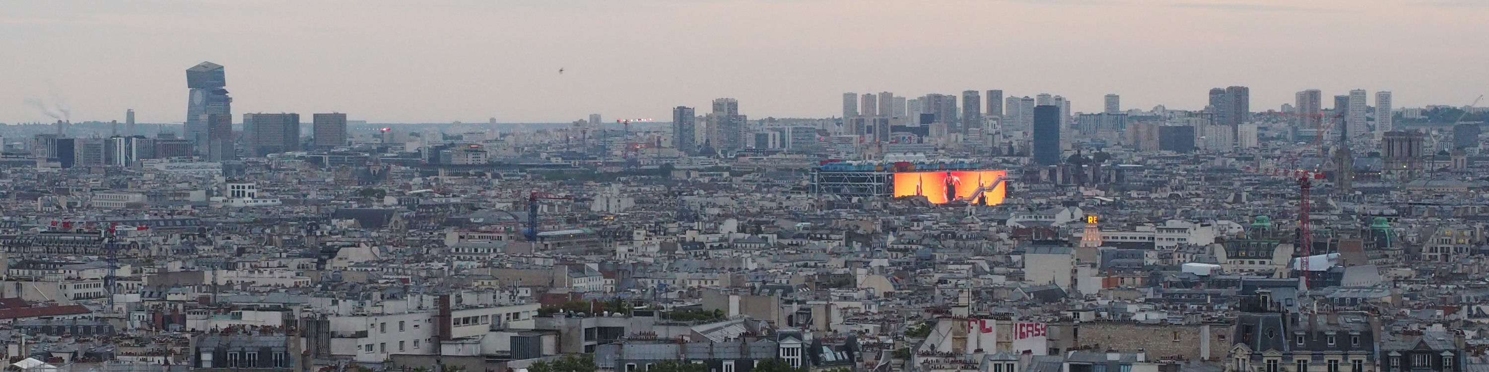 Panorama Montmartrelta. Erikoinen iso rakennus vasemmalla on Tour DUO. Pompidou-keskuksella on valtava olympianäyttö. Pariisi, RANSKA